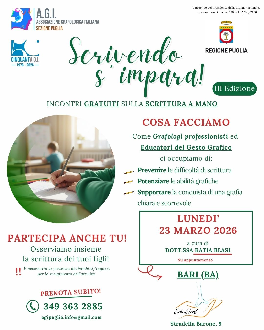 Lunedì 23 marzo 2026 a Bari si terrà la III edizione di “Scrivendo s’impara”, incontro gratuito dedicato alla scrittura a mano e alla prevenzione delle difficoltà grafiche nei bambini e ragazzi. L’iniziativa è promossa da grafologi professionisti ed educatori del gesto grafico.