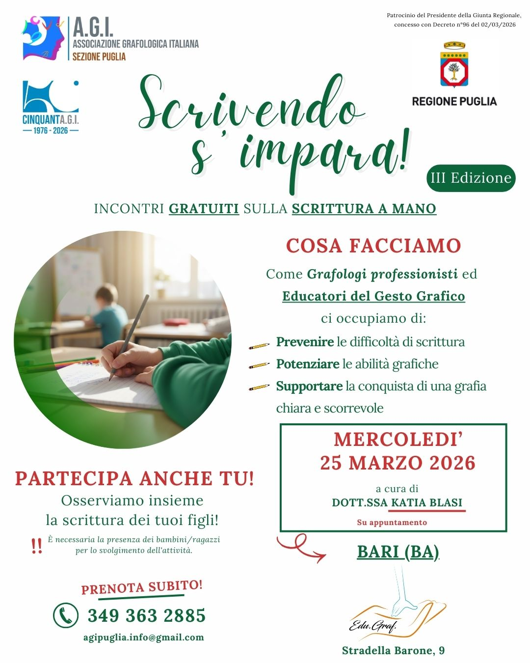 Mercoledì 25 marzo 2026 a Bari si terrà la III edizione di “Scrivendo s’impara”, incontro gratuito dedicato alla scrittura a mano e alla prevenzione delle difficoltà grafiche nei bambini e ragazzi. L’iniziativa è promossa da grafologi professionisti ed educatori del gesto grafico.